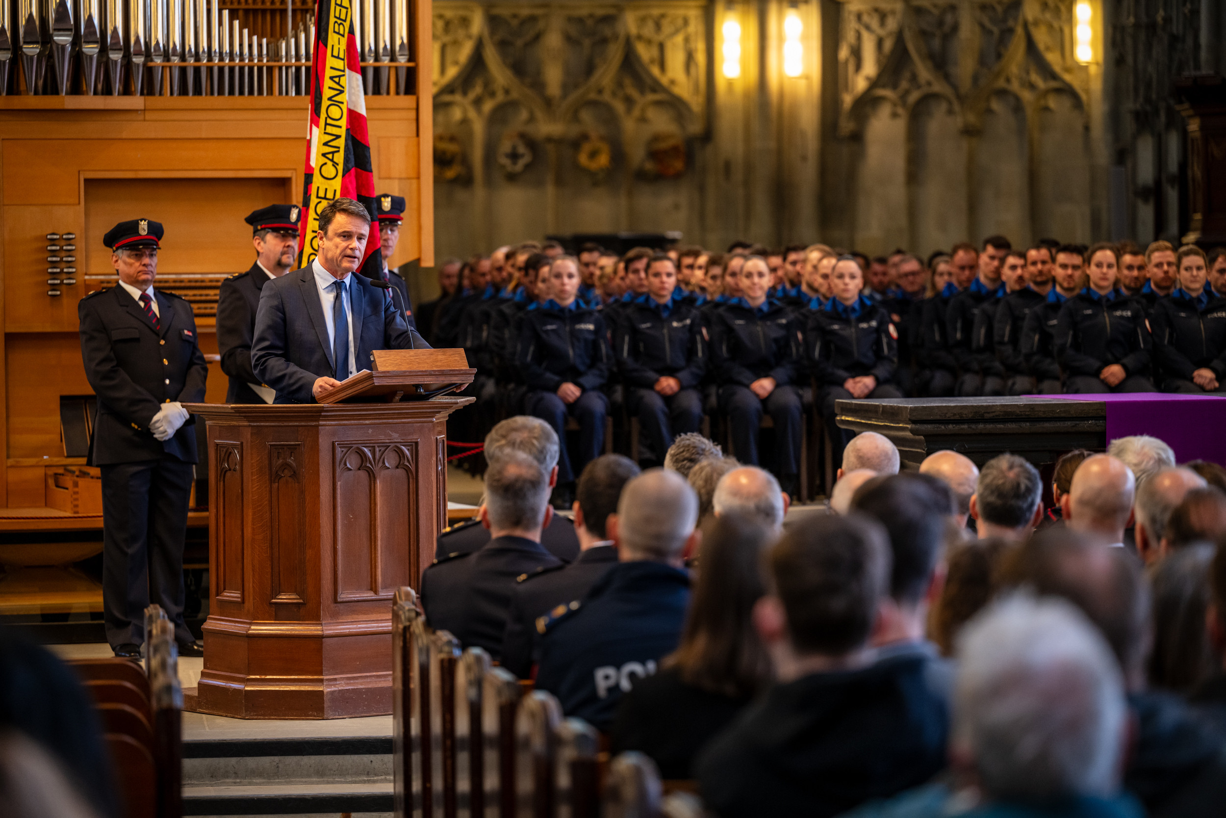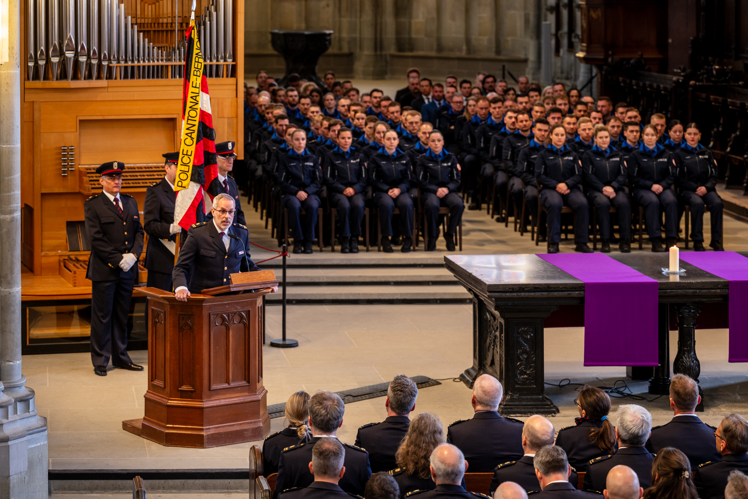 Die Kantonspolizei Bern heisst 96 Angehörige im Polizeikorps willkommen. Insgesamt wurden am Donnerstag, 19. März 2026, im Rahmen einer feierlichen Zeremonie im Berner Münster 32 Frauen und 64 Männer – uniformiert oder in ziviler Funktion – vereidigt. Sie legten den Schwur oder das Gelübde ab und wurden mit einem Handschlag von Regierungsrat Philippe Müller sowie vom Kommandanten der Kantonspolizei, Christian Brenzikofer, symbolisch in das Korps aufgenommen.