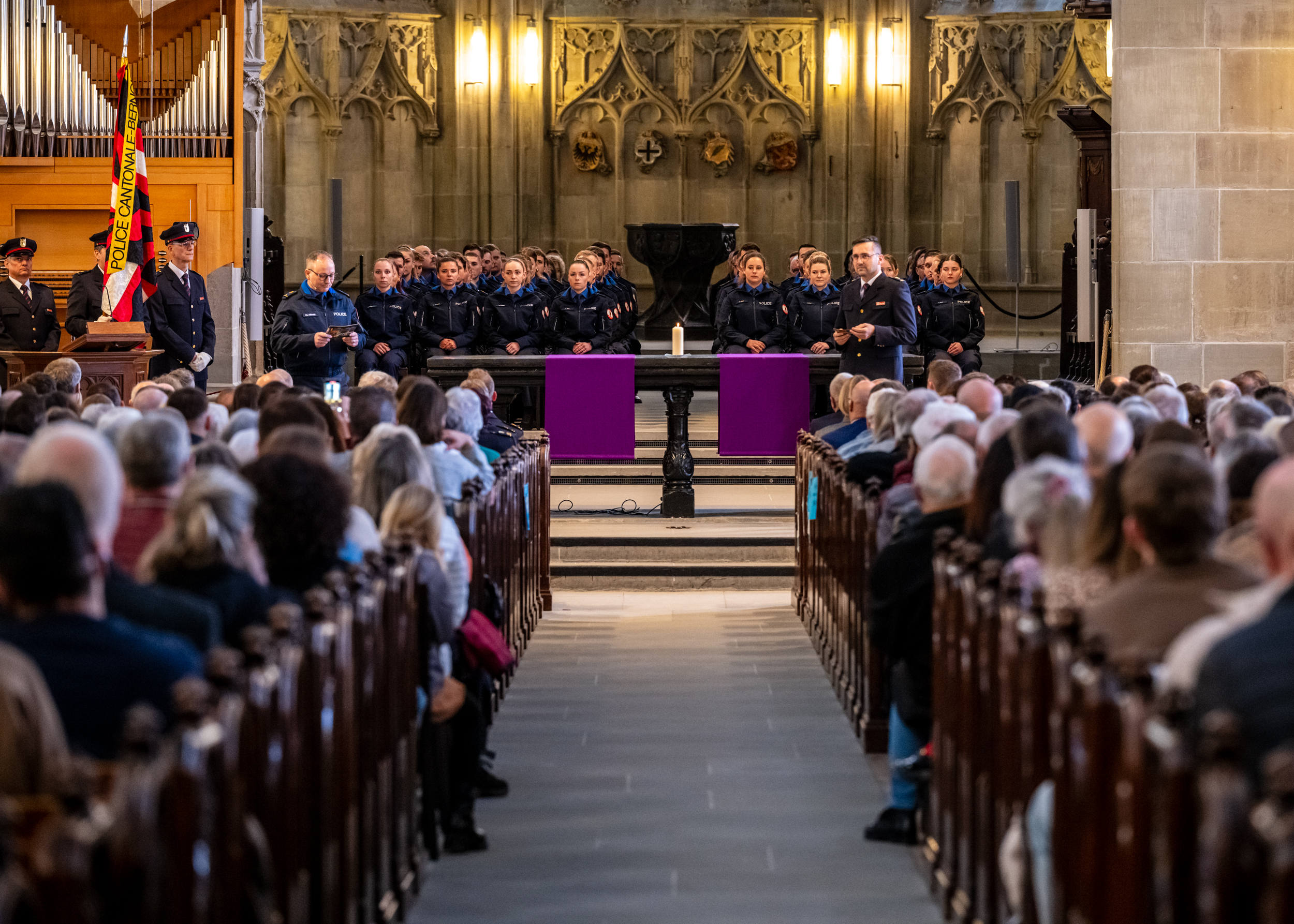 La Police cantonale bernoise a le plaisir d’accueillir officiellement 96 membres au sein du corps de police. En tout, 32 femmes et 64 hommes uniformés ou en civils ont été assermentés ce jeudi 19 mars 2026 au sein de la Collégiale de Berne lors d’une cérémonie festive. Par leur promesse faite à voix haute et une poignée de main échangée avec le conseiller d'État Philippe Müller ainsi qu’avec le Commandant de la Police cantonale Christian Brenzikofer, un engagement solennel en faveur de la collectivité a ainsi été signifié.